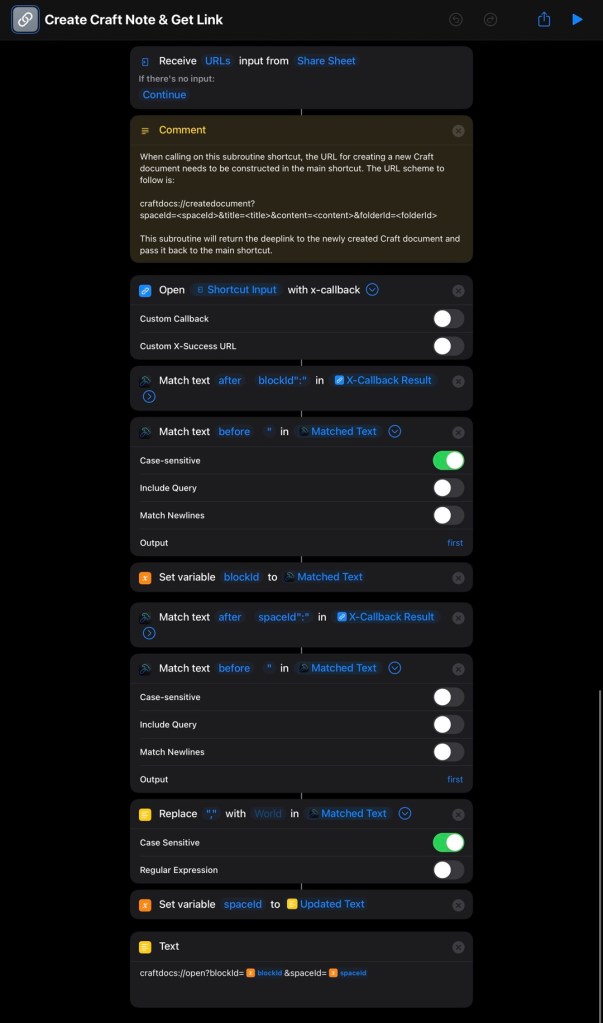 - New items to be saved can be sent to the shortcut via either the Share Sheet or the clipboard.